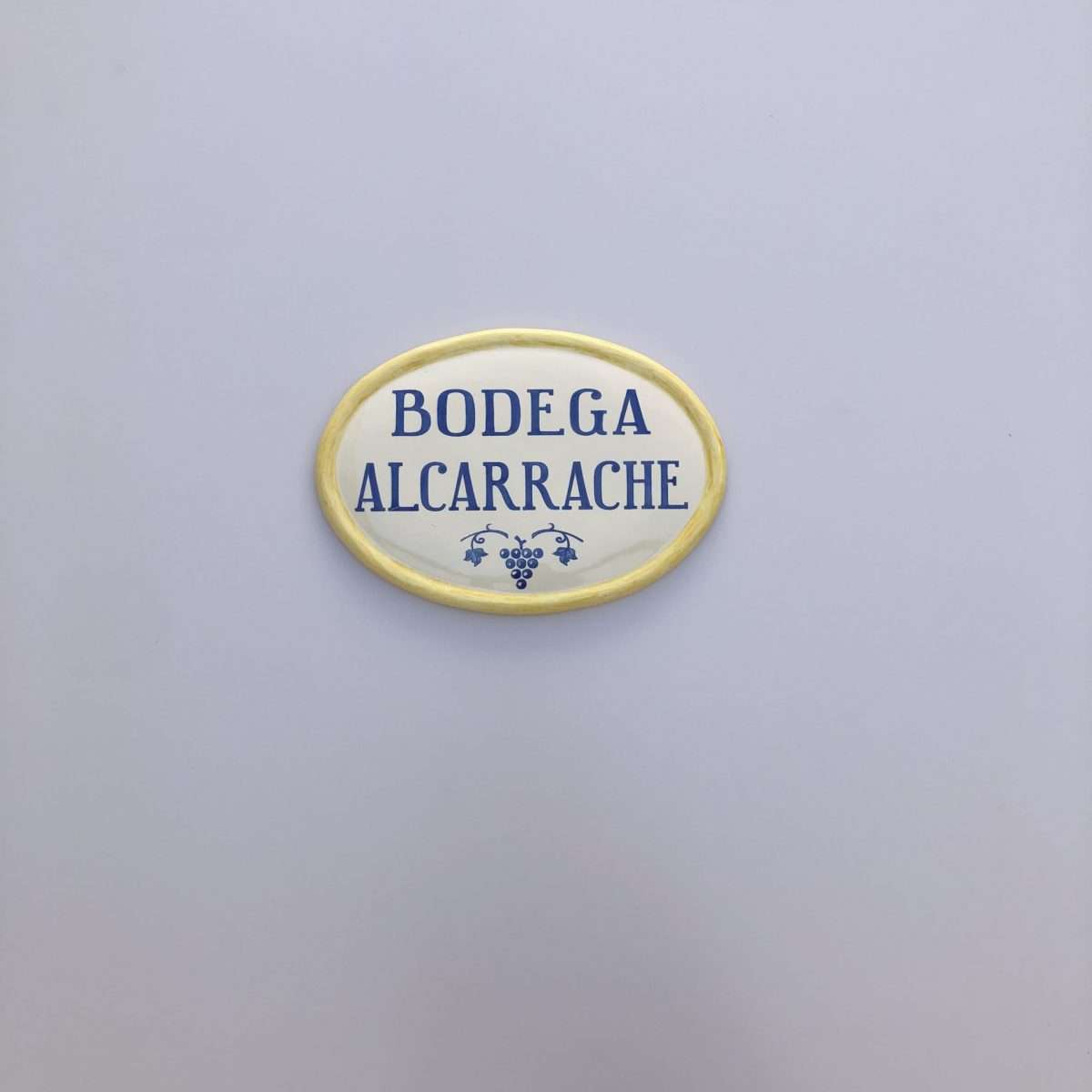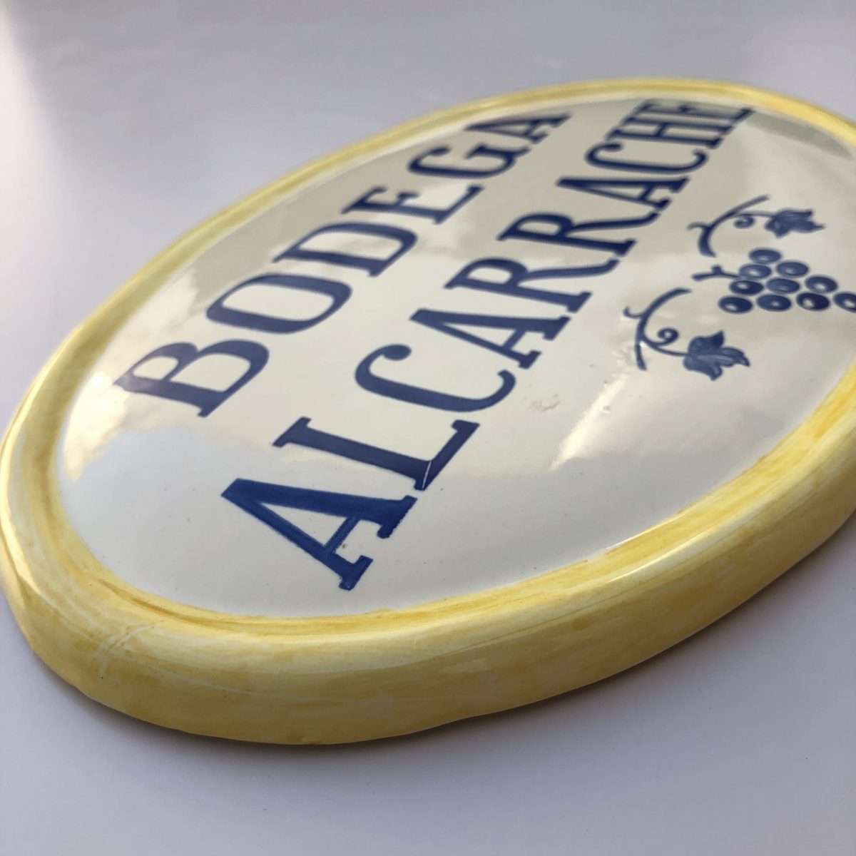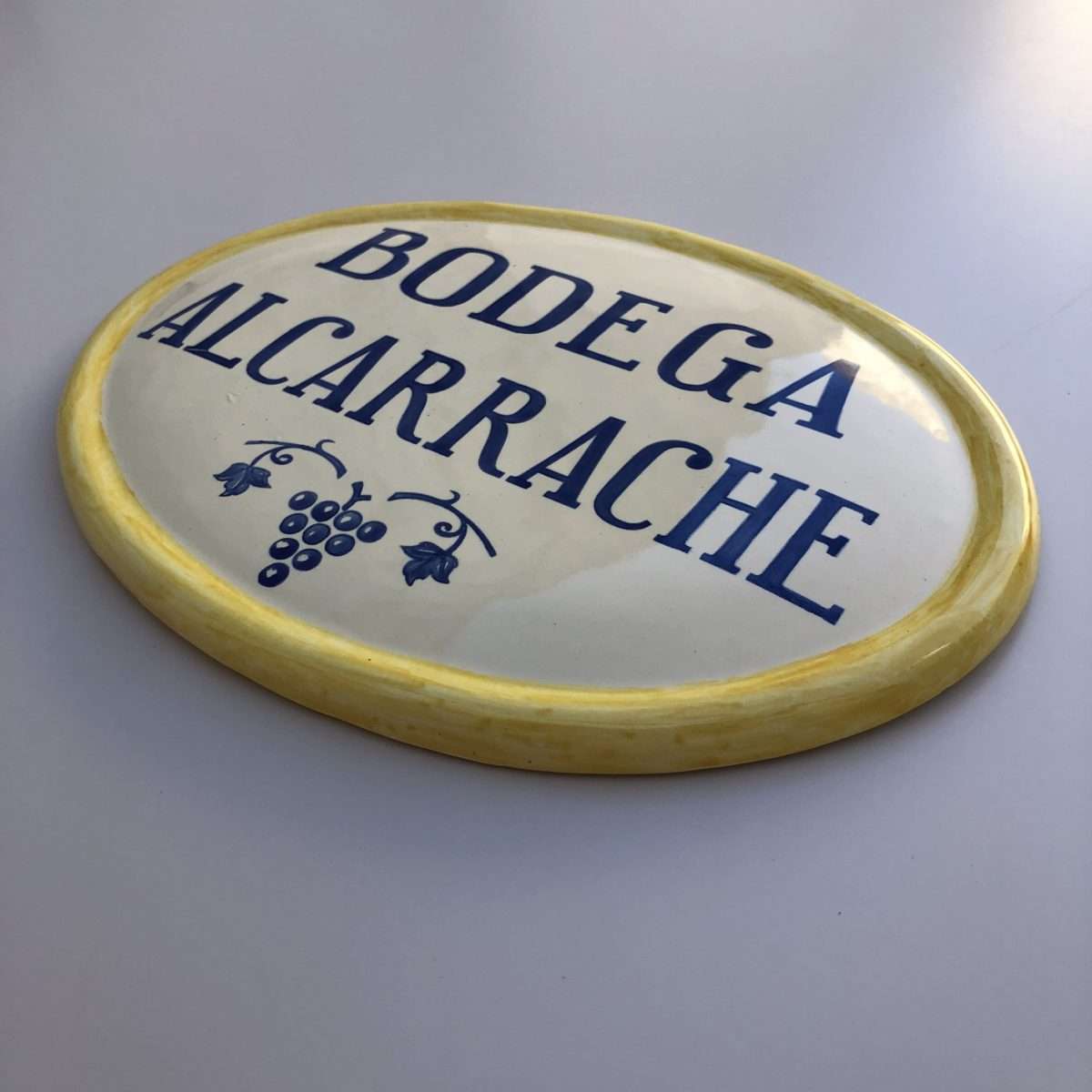 Placa ovalada con el nombre “BODEGA ALCARRACHE”, 28 x 20 cm, cerámica artesanal de España, letreros de dirección.